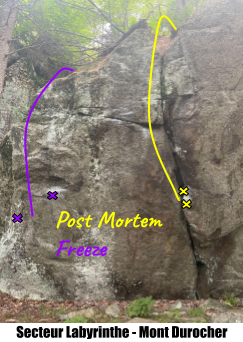 Départ debout sur l’arête de gauche. Main gauche sur la mauvaise prise sur le côté, main droite sur le bord sloper. Un mouvement pour les bonnes prises puis sortir.