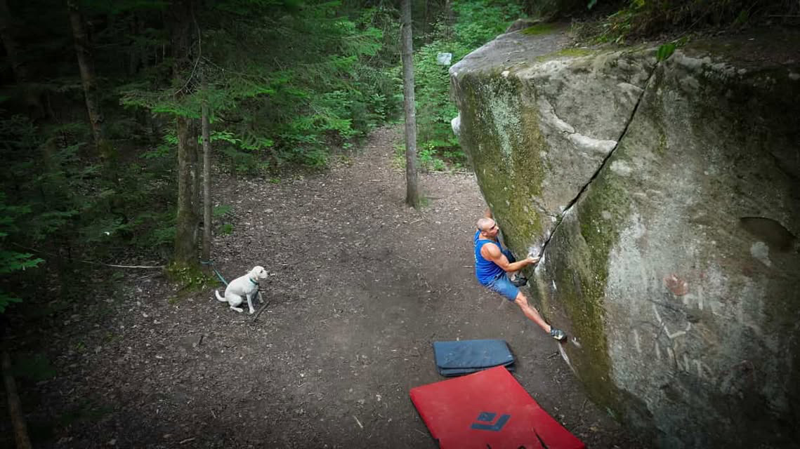 Départ debout. Main droite dans la fissure, main gauche sur l’arête puis transférer sur la fissure et grimper au sommet du bloc