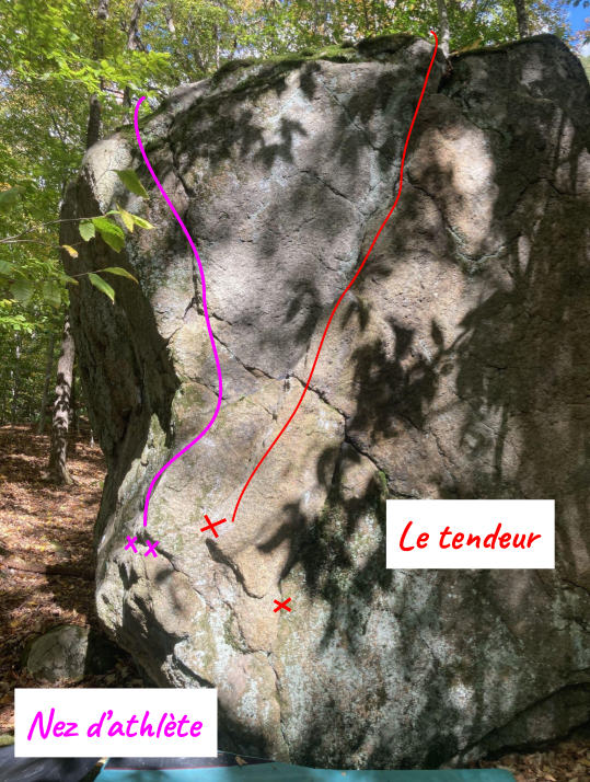 Départ assis, main gauche sur une réglette haute et main droite plus basse. Rejoindre la rampe haute et sortir tout droit.