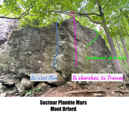 Bloc juste à droite de Planète Mars, départ sur des bonnes réglettes au centre du bloc et grimper en tendant vers la droite. Sortir à droite avec un bon sidepull pour la main gauche.