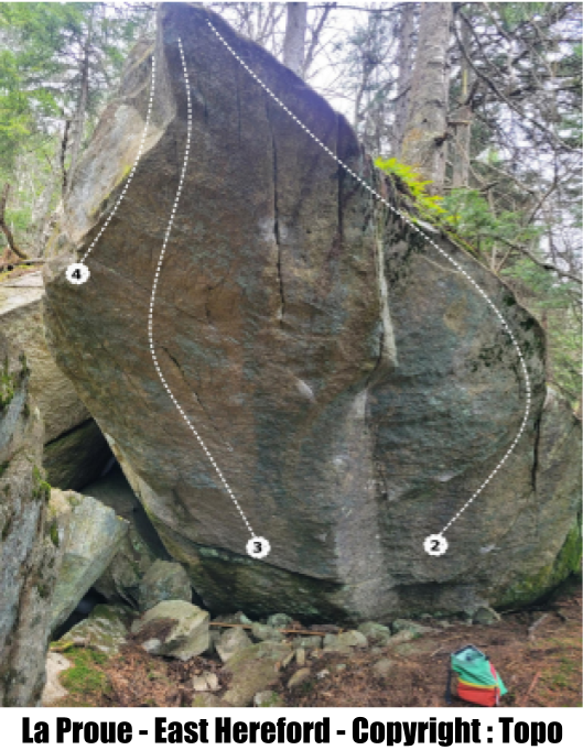 (Ligne 4) Départ haut main gauche et main droite sur les prises de l'arête (à 6 pieds du sol). Grimper vers la droite pour rejoindre le top de la proue et sortir