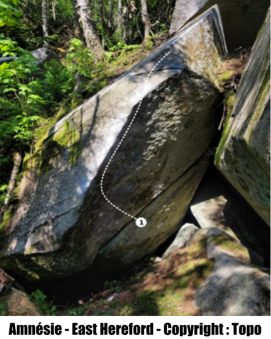 Départ assis, mains dans la fissure. Quelques mouvements techniques permettent de rejoindre de bonnes prises sur la dalle.