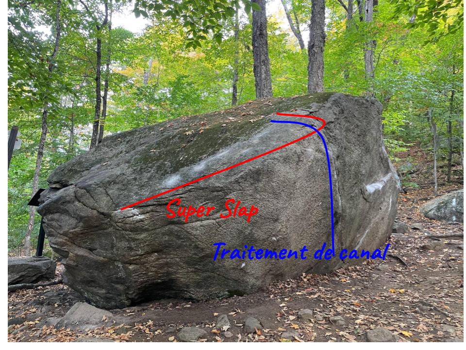 Départ assis, contourner le coin arrondis avec les slopes et sortir dans "Traitement de canal" (V3).