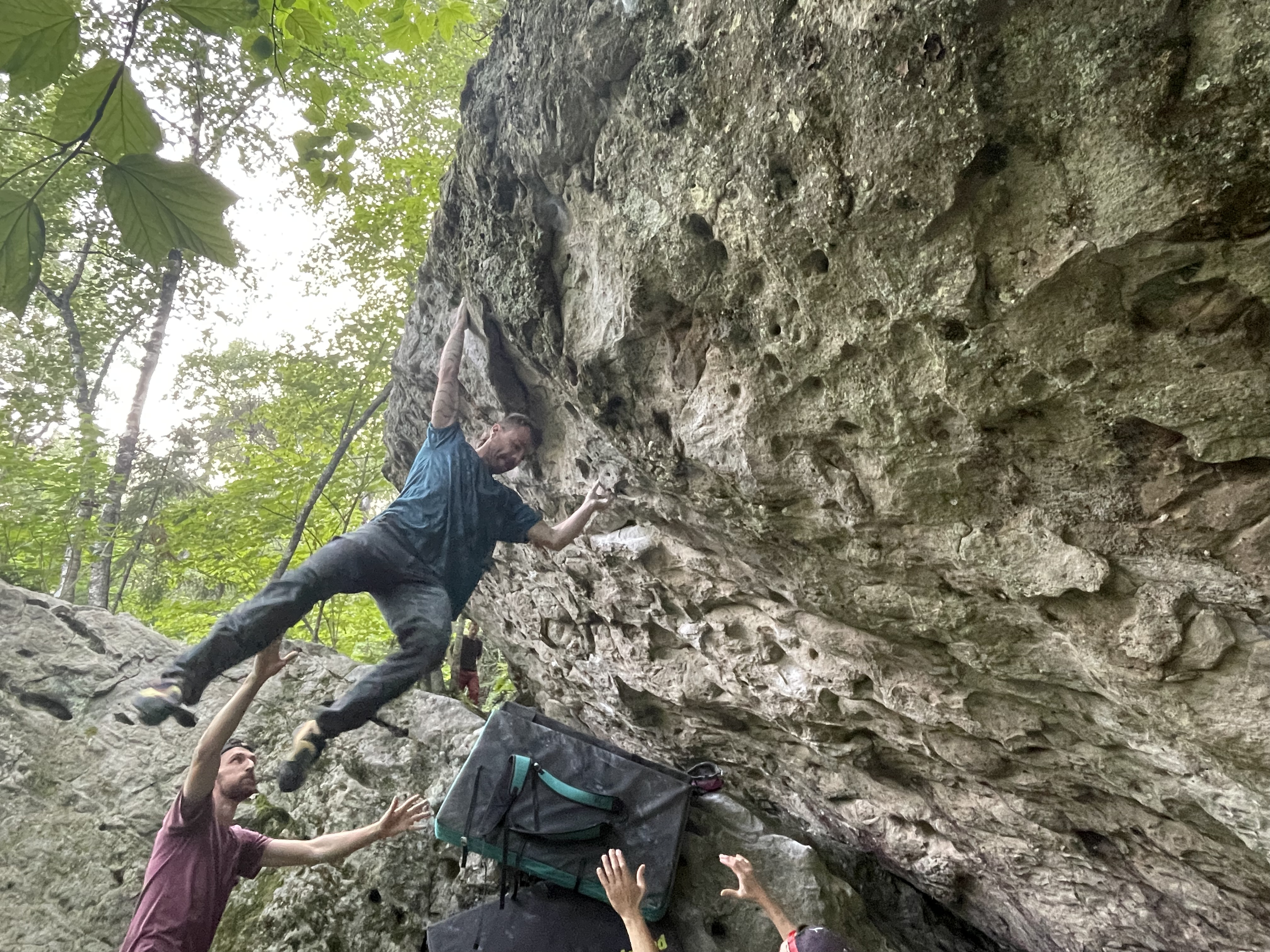 Départ debout sur une inversée main gauche et une réglette main droite. Enchaînement de quelques mouvements dans des pockets pour arriver dans un immense jug. Sortir au-dessus de ce dernier.